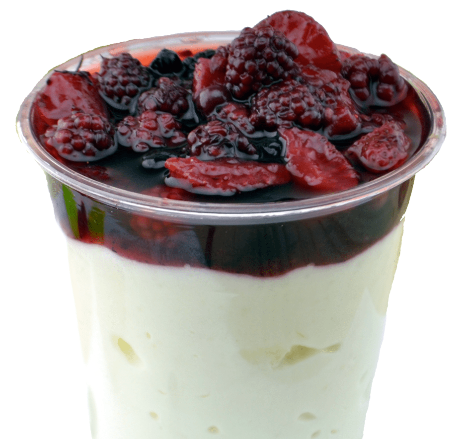 Delicioso esponjado de queso bajo en grasa recubierto con una exquisita salsa de mora y agraz.